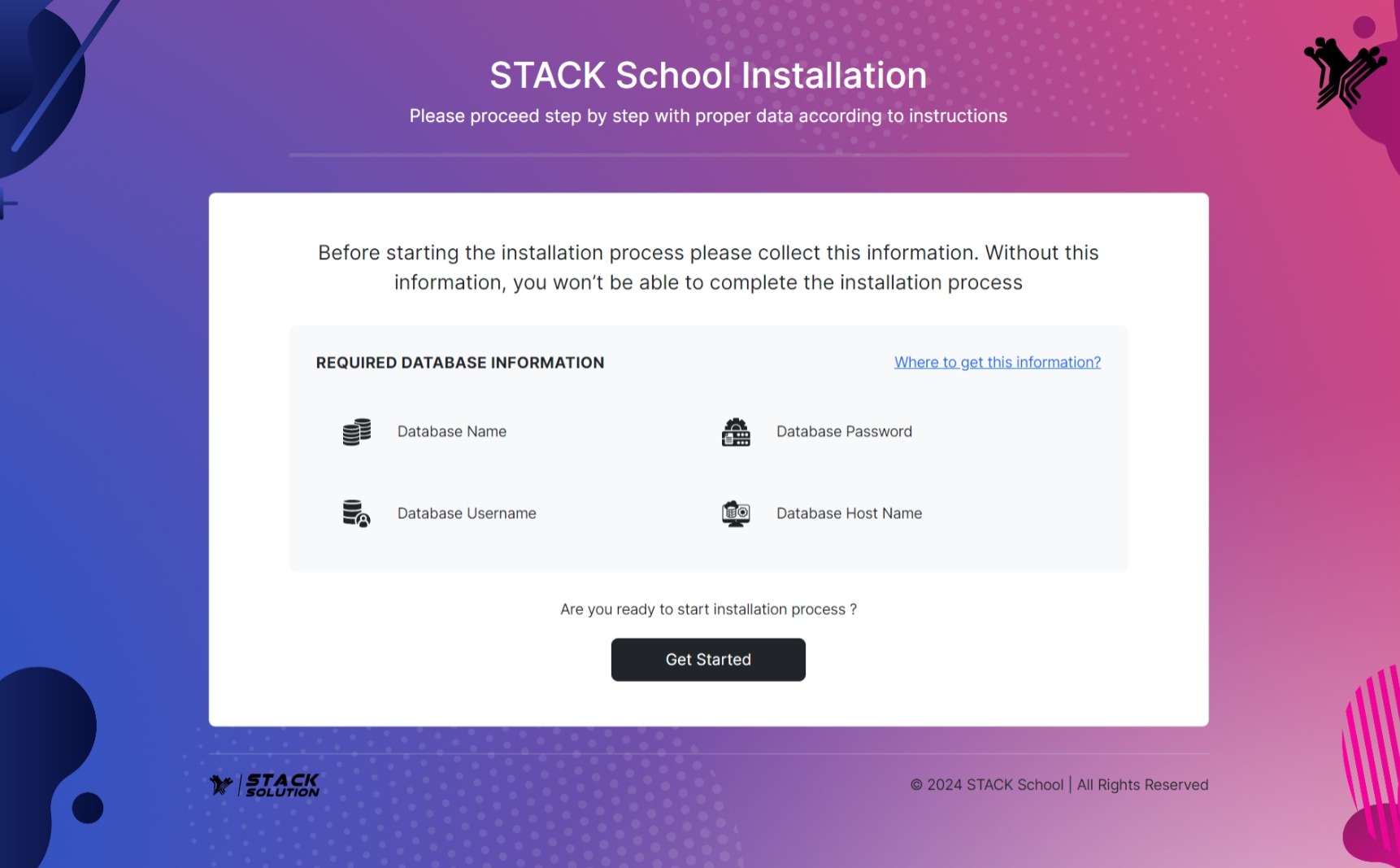 - First hit your site URL and it will automatically take you to the installation. Click Get Started to start.